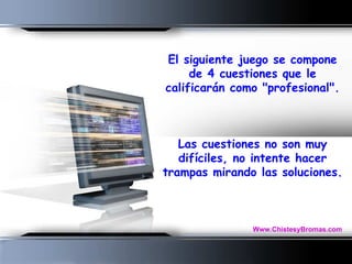 Este documento presenta 4 preguntas con el objetivo de evaluar la capacidad de razonamiento lógico. La primera pregunta trata sobre cómo guardar una jirafa en el refrigerador, la segunda sobre un elefante en el refrigerador tomando en cuenta la primera respuesta, la tercera sobre qué animal no asistió a una conferencia del Rey León basada en la segunda respuesta, y la cuarta sobre cómo cruzar un río con cocodrilos tomando en cuenta información de las respuestas anteriores. Un estudio encontró que la mayoría de profesionales fall
