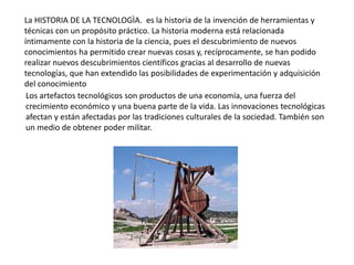 El documento describe brevemente la historia y propósito de la tecnología a través de la historia, desde la prehistoria hasta la actualidad. Explica que la tecnología ha sido usada para satisfacer necesidades básicas como alimentación y vivienda, pero también para placeres estéticos y como medio de poder. Además, la tecnología influye en el progreso económico y social aunque también puede causar problemas ambientales y de desigualdad si no se usa de forma sostenible.