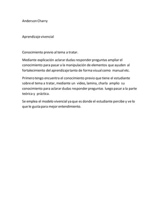 Este documento describe un método de aprendizaje vivencial que comienza evaluando el conocimiento previo del estudiante sobre un tema a través de videos o charlas. Luego, el instructor amplía el conocimiento del estudiante mediante explicaciones que aclaran dudas y responden preguntas antes de pasar a la parte teórica y práctica que involucra la manipulación de elementos. El modelo vivencial se usa para que el estudiante perciba directamente lo que está aprendiendo y mejore su comprensión.
