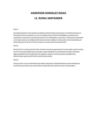El documento presenta tres pasos para mejorar el aprendizaje de los estudiantes. Primero, se enfatiza la importancia de vincular la formación de los estudiantes con el desarrollo de habilidades a través de la contextualización con la realidad. Segundo, se destaca el uso de herramientas didácticas innovadoras y plataformas virtuales para mejorar los procesos académicos. Tercero, se concluye que es fundamental que los docentes implementen nuevos métodos de enseñanza para enriquecer el aprendizaje de los