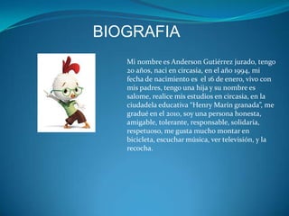 Este documento presenta la biografía y presentación de Anderson Gutiérrez Jurado, un técnico en gestión del talento humano del SENA. Resume su vida y educación, incluyendo que nació en Circasia en 1994, se graduó de bachiller en 2010, y desde entonces ha completado varios títulos técnicos. Actualmente está estudiando para convertirse en tecnólogo en gestión del talento humano a través de un programa del SENA.