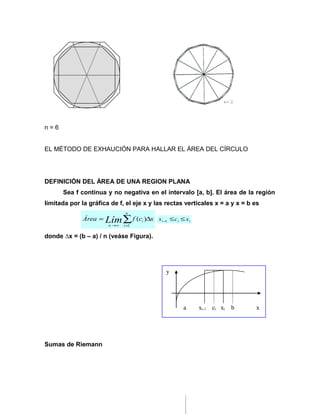 Este documento describe los conceptos fundamentales de las sumas de Riemann y la integración. Introduce la definición del área de una región plana limitada por una función continua mediante el límite de sumas. Luego define las sumas de Riemann como una generalización de este concepto que permite calcular magnitudes como longitudes, valores medios y volúmenes. Finalmente, presenta las propiedades básicas de las funciones integrables y los teoremas fundamentales del cálculo integral.