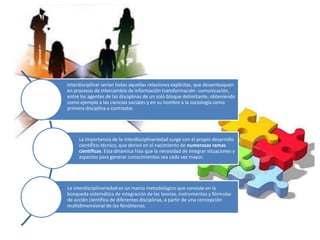 La interdisciplinariedad consiste en la búsqueda sistemática de integrar teorías, métodos e instrumentos de diferentes disciplinas basados en una concepción multidimensional de los fenómenos. Surge del desarrollo científico que llevó al nacimiento de nuevas ramas y a una necesidad creciente de integrar situaciones para generar conocimiento. Implica reconocer el carácter relativo de los enfoques disciplinarios por separado.