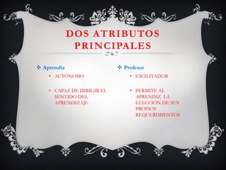 Este documento describe los principios de la andragogía, la ciencia de la educación de adultos. La andragogía se basa en cinco suposiciones sobre cómo aprenden los adultos: que son autodirigidos, utilizan su experiencia como base de aprendizaje, están orientados a la aplicación práctica, se motivan intrínsecamente y se orientan hacia el aprendizaje. El profesor actúa como facilitador permitiendo al aprendiz elegir sus propios objetivos. La andragogía se aplica a través de preguntas abiertas