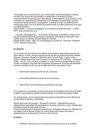 Este documento describe los conceptos clave de la andragogía y su importancia para la educación continua de adultos. Explica que la andragogía se refiere a la educación y aprendizaje de adultos, tomando en cuenta sus características como seres biopsicosociales con experiencia. También describe las características de los adultos como aprendices y el papel del educador andragógico, quien debe facilitar el aprendizaje centrándose en las necesidades de los estudiantes adultos y promoviendo su autonomía.