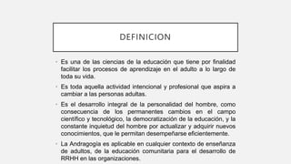 El documento define la andragogía como la ciencia de la educación de adultos que busca facilitar procesos de aprendizaje a lo largo de la vida. Explica que la andragogía se enfoca en cambiar activamente a los adultos mediante el desarrollo integral de su personalidad. Los principios de la andragogía incluyen comprender las necesidades del alumno adulto, reconocer su autoconcepto como autónomo y basado en experiencias, y orientar el aprendizaje hacia situaciones de la vida real.