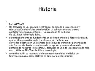 Este documento resume la historia y evolución del televisor desde su invención en 1926 por John Logie Baird hasta los modelos más modernos. Describe los primeros modelos mecánicos y cómo se volvieron totalmente eléctricos, así como los modelos representativos de las décadas de 1940 a 1980 de empresas como Zenith, Magnavox y otros. Finalmente, explica cómo los avances tecnológicos han permitido televisores más innovadores como los de plasma, LCD y alta definición.