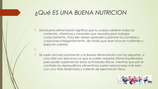 Una buena nutrición significa que el cuerpo obtiene todos los nutrientes necesarios para funcionar correctamente. Esto requiere planear comidas y colaciones balanceadas, ricas en nutrientes y bajas en calorías. Una dieta equilibrada es importante para la salud y la energía, y ayuda a mantener un peso saludable. Se debe incluir granos integrales, frutas, verduras y legumbres, las cuales contienen vitaminas, minerales y antioxidantes que protegen contra enfermedades. También es importante limitar el consumo de grasas