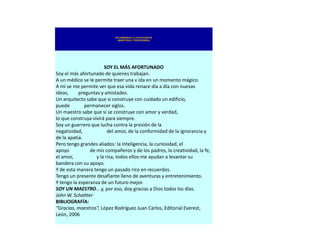 El documento rinde homenaje a los maestros y profesores, destacando que son los más afortunados por poder ayudar a los estudiantes a desarrollarse día a día con nuevas ideas y amistades, y por construir algo que vivirá para siempre. Los maestros luchan contra fuerzas negativas pero cuentan con aliados como la inteligencia, curiosidad, creatividad y apoyo de los estudiantes y padres.