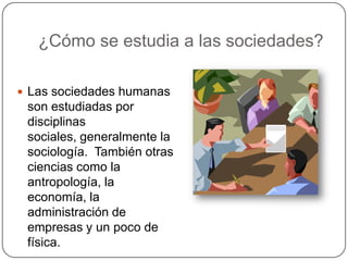 La sociedad humana se define como un conjunto de individuos que comparten cierto grado de comunicación, cooperación y cultura. Las sociedades son estudiadas principalmente por la sociología y otras disciplinas como la antropología y la economía. Existen diversas culturas y tipos de sociedades en todo el mundo.
