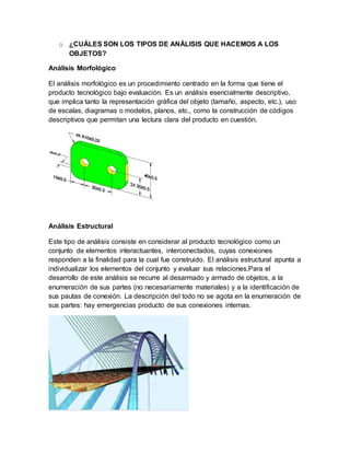 Este documento describe diferentes tipos de análisis que se pueden realizar a objetos, incluyendo análisis morfológico, estructural, funcional, tecnológico, económico, comparativo e histórico. El análisis de objetos sirve para describirlos aplicando conocimientos tecnológicos y obtener información sobre objetos que se quieran diseñar. Se provee como ejemplo el análisis de una esferográfica.