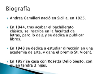 Andrea Camilleri nació en Sicilia en 1925. Tras estudiar letras y dirección de cine, trabajó como guionista y director de teatro y televisión durante 40 años. En 1992 retomó la escritura y publicó su primera novela protagonizada por el Comisario Montalbano, su personaje más conocido, un comisario siciliano que resuelve crímenes de forma poco ortodoxa.