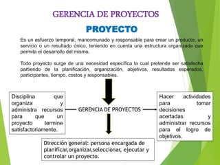 La gerencia de proyectos es la disciplina que organiza y administra los recursos para que un proyecto se complete satisfactoriamente. Un proyecto surge de una necesidad específica y requiere planificación, organización, objetivos, resultados esperados, participantes, tiempo y costos. La dirección general de un proyecto se encarga de planificar, organizar, seleccionar, ejecutar y controlar todas las fases del ciclo de vida de un proyecto, el cual incluye las fases inicial, intermedia y final.