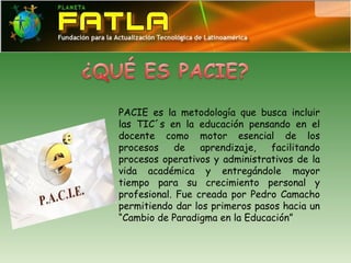 PACIE es una metodología creada por Pedro Camacho para incluir las TIC en la educación centrada en el docente. Busca facilitar procesos operativos y administrativos para darles más tiempo a los docentes a su crecimiento personal y profesional, permitiendo dar los primeros pasos hacia un cambio de paradigma en la educación.