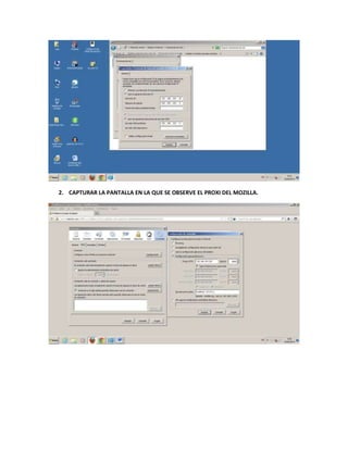 Este documento presenta una práctica de 6 pasos para capturar y configurar información en el navegador Mozilla Firefox, incluyendo capturar imágenes de la dirección IP, la pantalla del navegador, configurar la página de inicio, cambiar la carpeta de descargas, y capturar el historial. También analiza frases relacionadas con los peligros y beneficios del uso de Internet, como plagio, exceso de información, pérdida de habilidades de estudio, dependencia excesiva y poco uso en educación.
