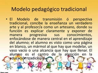 El documento describe varios modelos pedagógicos tradicionales. El modelo pedagógico tradicional se centra en el maestro transmitiendo conocimiento a estudiantes pasivos. Los principales exponentes incluyen a Skinner, quien promovió el conductismo, y Comenio, quien promovió la enseñanza sistemática. El modelo pedagógico conductista se basa en objetivos medibles y refuerzos para moldear la conducta de los estudiantes. El modelo pedagógico desarrollista busca que los estudiantes accedan a n