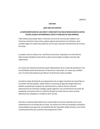 Los costos son los recursos necesarios para operar una empresa y pueden ser fijos o variables. Los costos fijos permanecen igual independientemente de los niveles de producción, mientras que los costos variables cambian según la producción. Para tener éxito, las empresas deben implementar estrategias constantes para reducir costos fijos a niveles mínimos, como consumo de servicios y gastos de administración. La selección del sistema de costos depende del tamaño de la empresa, sus objetivos, necesidades de información y características de la