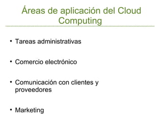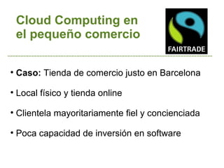 El documento describe cómo una pequeña tienda de comercio justo en Barcelona está utilizando las soluciones en la nube para mejorar sus operaciones administrativas, comercio electrónico y comunicación con clientes y proveedores. Algunas de las aplicaciones en la nube discutidas incluyen Google Apps para tareas administrativas, tiendas en línea para comercio electrónico y Skype para comunicación. El documento concluye que estas soluciones en la nube brindan beneficios económicos, de rapidez y de marketing para las pequeñas empresas.