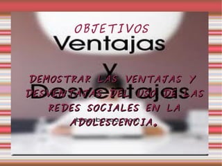 Este documento resume las ventajas y desventajas del uso de redes sociales en la adolescencia. Entre las ventajas se encuentran que permiten conocer personas de otras partes del mundo, mantenerse en contacto con amigos y estar informado sobre eventos actuales. Las desventajas incluyen la invasión de la privacidad al solicitar información personal, falta de seguridad de la información compartida y la posible adicción al uso excesivo de las redes. El documento concluye recomendando utilizar las redes sociales con precaución y moderación para
