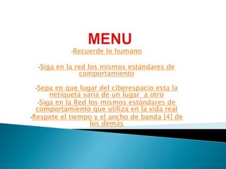 El documento ofrece consejos sobre la netiqueta y el comportamiento ético en internet. Recomienda recordar que hay personas reales del otro lado y seguir los mismos estándares de comportamiento que en la vida real. Además, sugiere observar las normas de una comunidad online antes de participar y respetar el tiempo y ancho de banda de los demás.