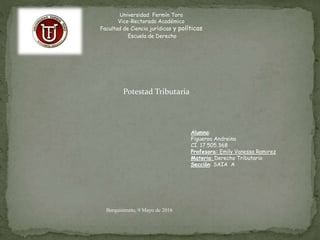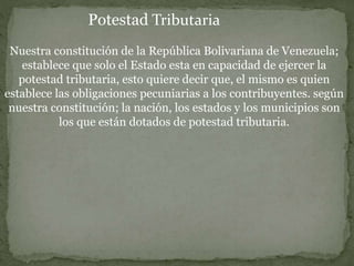 El documento describe la potestad tributaria del Estado venezolano y sus diferentes niveles (nacional, estadal y municipal). Explica que solo el Estado puede ejercer la potestad tributaria de acuerdo a la Constitución, estableciendo obligaciones pecuniarias a los contribuyentes. También analiza las diferentes clasificaciones de la potestad tributaria y sus principales características y limitaciones de acuerdo al marco legal venezolano.