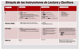 Este documento describe diferentes tipos de lenguajes de programación y sus características. Incluye lenguajes como C, Python, Visual Basic, Pascal y sus tipos de datos, operadores aritméticos y lógicos, estructuras de control como bucles y condicionales.
