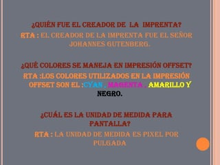 El documento proporciona respuestas breves a preguntas sobre el proceso de artes gráficas e impresión. Explica que Johannes Gutenberg fue el creador de la imprenta, que los colores utilizados en impresión offset son cian, magenta, amarillo y negro, y que la unidad de medida para pantalla es el pixel por pulgada. También indica que el color negro aparece en la mezcla CMYK para evitar triplicar el costo de imprimir en color, y que las marcas de registro de color sirven para aline