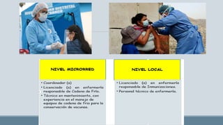 Este documento describe los conceptos clave de la cadena de frío para vacunas. Explica que la cadena de frío asegura el transporte, almacenamiento y manipulación de vacunas dentro de los rangos de temperatura establecidos para mantener su efectividad. También describe los diferentes niveles de la cadena de frío, los elementos clave como equipos, infraestructura y personal, y los factores que afectan la estabilidad de las vacunas como la temperatura, luz y fecha de vencimiento.