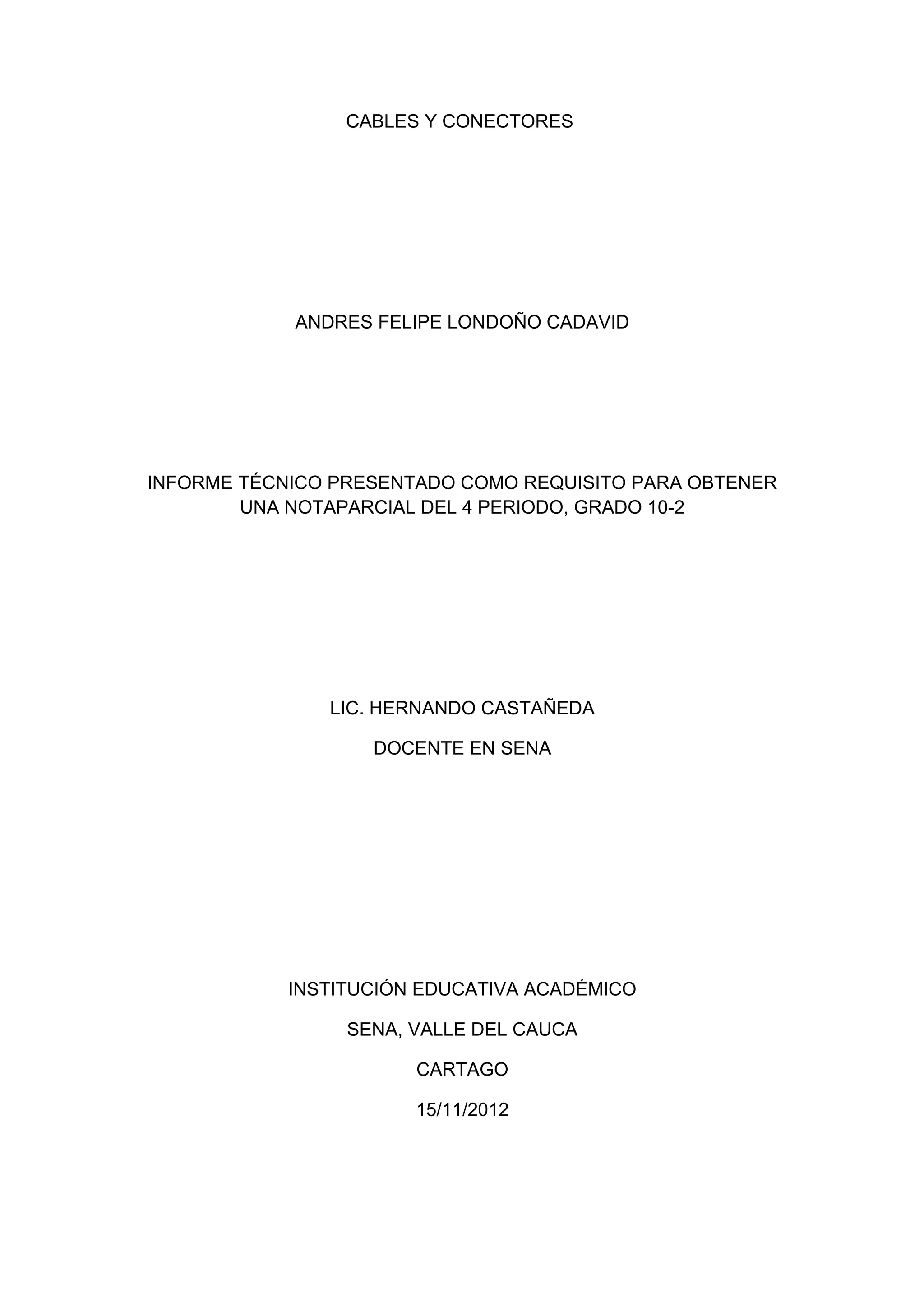 El documento habla sobre cables y conectores en computadores. Explica las partes principales de un computador como la fuente de alimentación, la placa base, la CPU y tarjetas de adaptador. También cubre discos internos y externos y cómo conectar diferentes cables internos para completar el ensamble del computador.