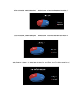 El documento presenta datos estadísticos sobre el maltrato infantil en Bogotá según la edad y el sexo. Muestra una tabla con el número de casos de maltrato infantil entre mujeres y hombres en diferentes grupos de edad (0-4 años, 5-9 años, 10-14 años, 15-17 años y sin información). Luego genera gráficos que comparan los porcentajes de mujeres y hombres afectados en cada grupo etario. El gráfico final muestra que el 53% de los casos de maltrato infantil en Bogotá corresponden a mujeres.