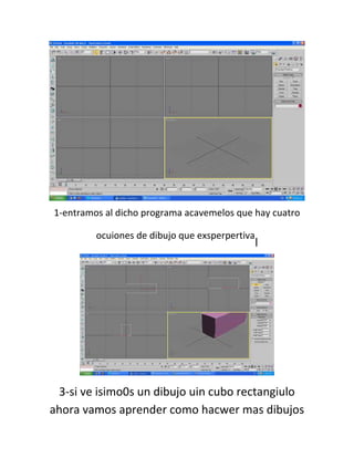 Este documento presenta 6 pasos para dibujar en Autodesk Studio Max, incluyendo entrar al programa y seleccionar una de las 4 opciones de dibujo, aprender a dibujar formas básicas como un cubo o rectángulo, crear varias figuras o diseñar las propias, posicionar las figuras en los ejes XYZ, sacar figuras de cualquier lado del programa, y guardar los dibujos creados.