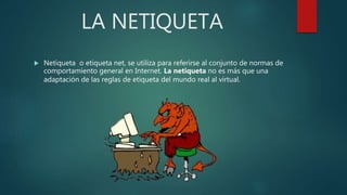 La netiqueta se refiere a las normas de comportamiento en Internet, adaptadas de las reglas de etiqueta del mundo real. Estas pautas promueven interacciones respetuosas y educadas entre los usuarios para fomentar buenas relaciones en línea. El documento también detalla reglas específicas y su aplicación en blogs, abarcando aspectos como autoría, escritura y comentarios.