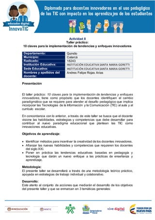 El taller práctico tiene como objetivo que los docentes del Quindío identifiquen e implementen nuevas tendencias educativas y enfoques innovadores, especialmente en el uso de tecnologías de la información y comunicación (TIC) en el aula. Se busca desarrollar habilidades y competencias adecuadas para el siglo XXI, explorando metodologías teórico-prácticas que incluyan el aprendizaje basado en proyectos y la personalización del aprendizaje. Al final, se espera que los docentes creen un análisis acerca de cómo estas tendencias impactan su práctica educativa y se relacionen con políticas públicas relevantes.