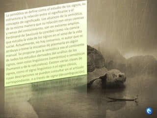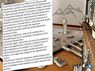 Este documento presenta información sobre lenguaje visual y semántica. Explica que el punto, la línea, el plano y el volumen son elementos básicos del lenguaje visual. Define los conceptos de logotipo, isotipo e imagotipo. Luego describe la semántica en ciencias cognitivas y matemáticas, explicando cómo la mente atribuye significados y cómo la lógica de predicados de primer orden utiliza modelos para interpretar expresiones formales.