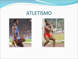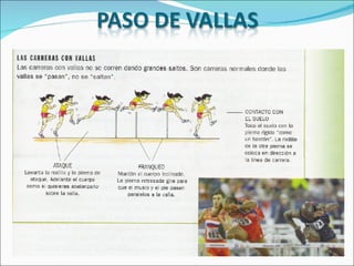 Este documento describe los orígenes del atletismo en los Juegos Olímpicos de la antigua Grecia y su resurgimiento en los Juegos Olímpicos modernos de 1896. Explica las diferentes pruebas de atletismo como la carrera, la zancada, y los errores comunes. Finalmente, proporciona detalles técnicos sobre cómo ejecutar correctamente una carrera.