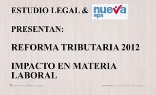 El documento presenta una reforma tributaria colombiana de 2012 y su impacto en materia laboral. Resume los objetivos de la reforma de generar empleo a través de exenciones en parafiscalidades y seguridad social, y promover la equidad mediante la reducción de la desigualdad. Explica cambios en impuestos corporativos, parafiscalidades, seguridad social, y rentas de trabajo como resultado de la reforma.