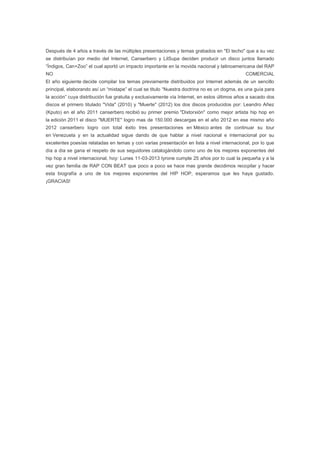 Este documento presenta una biografía del rapero venezolano Tyrone González Orama, conocido como "Canserbero". Nació en 1988 en Caracas y se crio en Maracay, donde comenzó a interesarse por la música a los 11 años. Formó varios grupos de rap como "Códigos de Barrio" y se unió al colectivo "Basyco", ayudando a establecer el género del "Rap conciencia" en Venezuela. Ha lanzado varios discos en solitario que han tenido éxito nacional