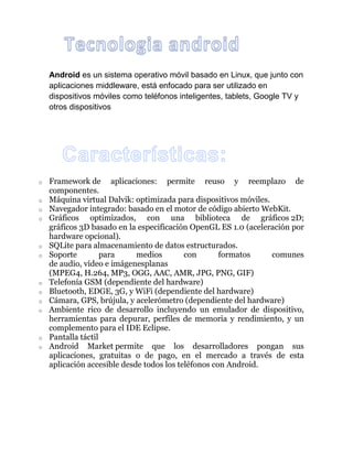 Android es un sistema operativo móvil basado en Linux diseñado para dispositivos móviles como teléfonos inteligentes y tablets. Utiliza un framework de aplicaciones que permite reutilizar y reemplazar componentes, una máquina virtual optimizada para dispositivos móviles llamada Dalvik, e incluye un navegador basado en WebKit, gráficos 2D y 3D, soporte para almacenamiento de datos, medios y formatos comunes, y características dependientes del hardware como telefonía, Bluetooth y cámara.