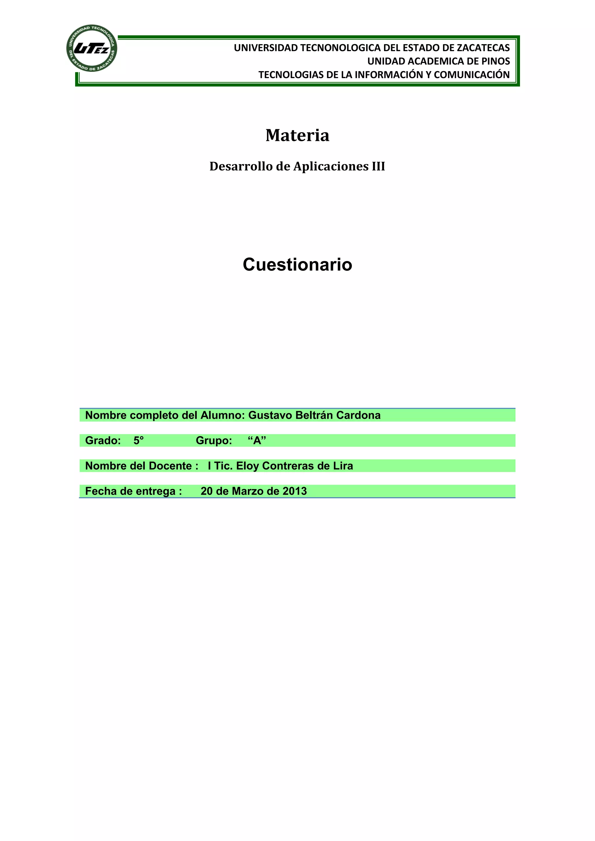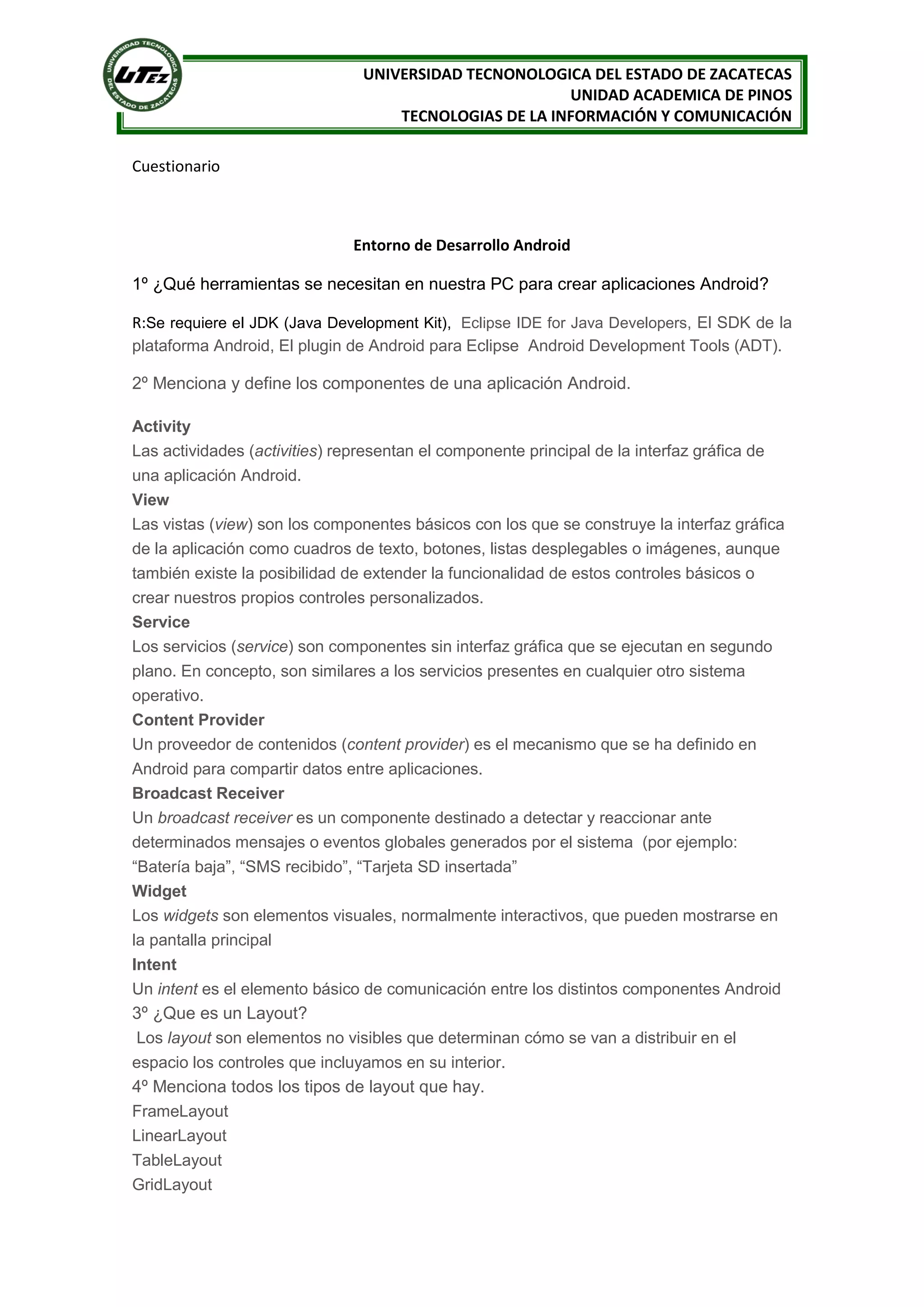Este documento contiene las respuestas a un cuestionario sobre el desarrollo de aplicaciones Android. El cuestionario cubre temas como las herramientas de desarrollo Android, los componentes de una aplicación Android, los tipos de layouts y controles, el uso de menús y preferencias, y el acceso a bases de datos SQLite. El estudiante responde 15 preguntas sobre estos temas centrales del desarrollo móvil en Android.