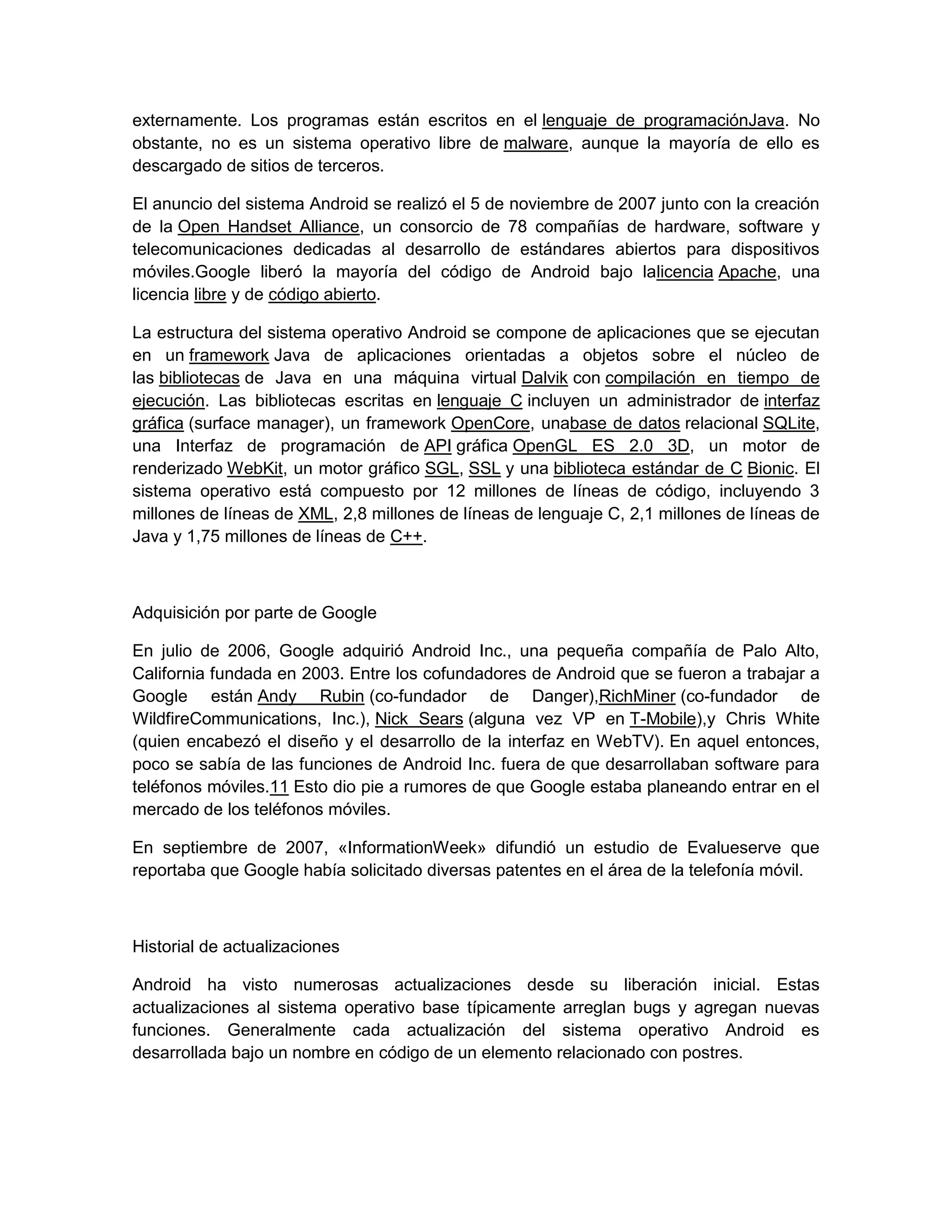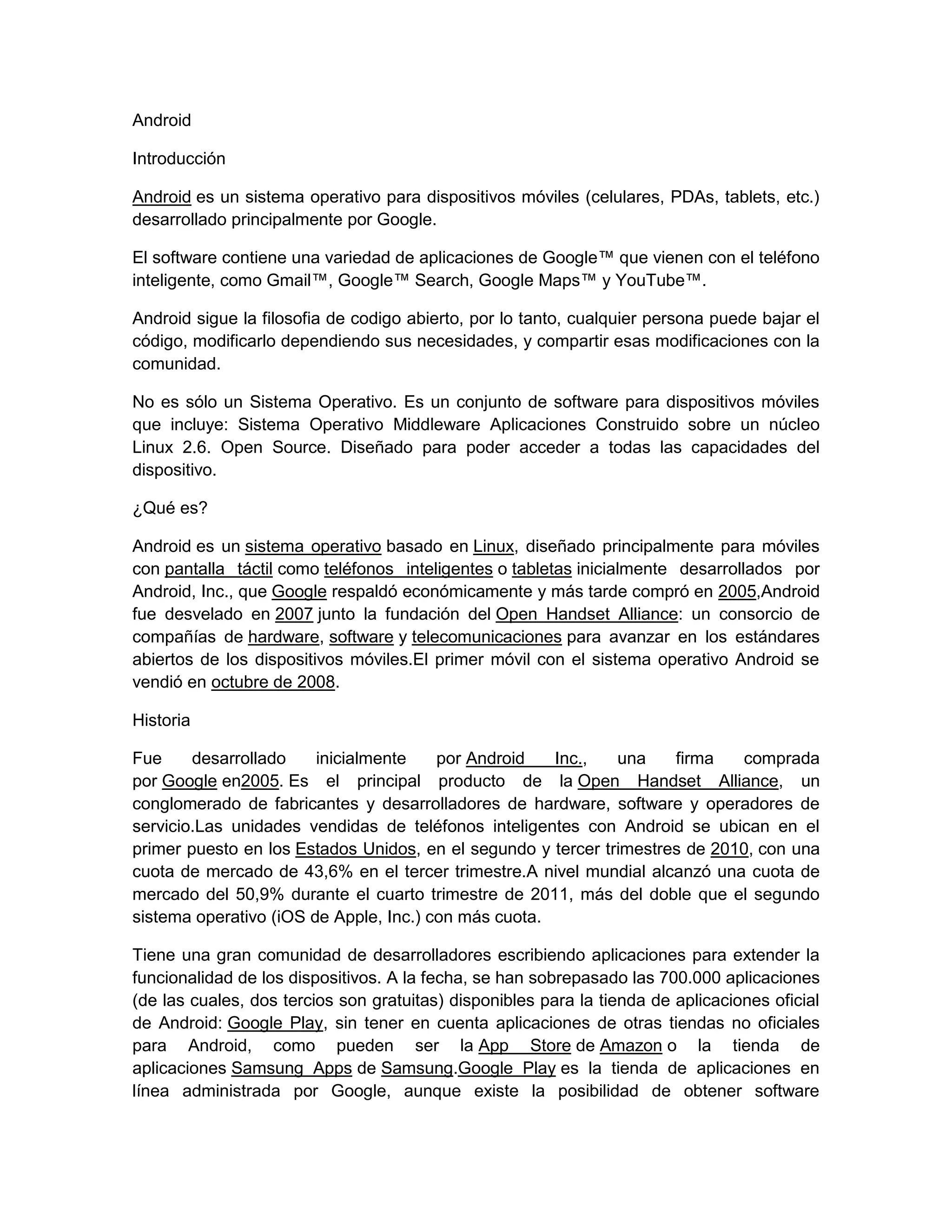 Android es un sistema operativo de código abierto principalmente para dispositivos móviles como teléfonos inteligentes y tabletas desarrollado inicialmente por Android Inc. y ahora propiedad de Google. Proporciona una plataforma para aplicaciones, un marco de trabajo de Java y soporte para hardware común en dispositivos móviles. Android tiene la mayor cuota de mercado mundial entre los sistemas operativos móviles.