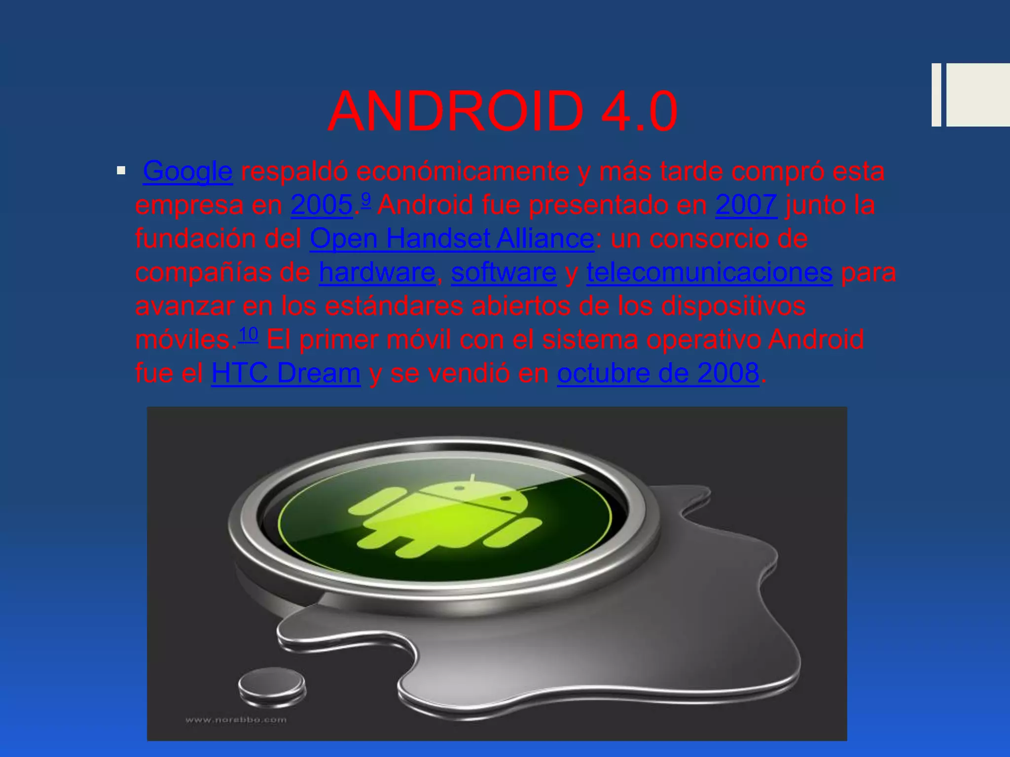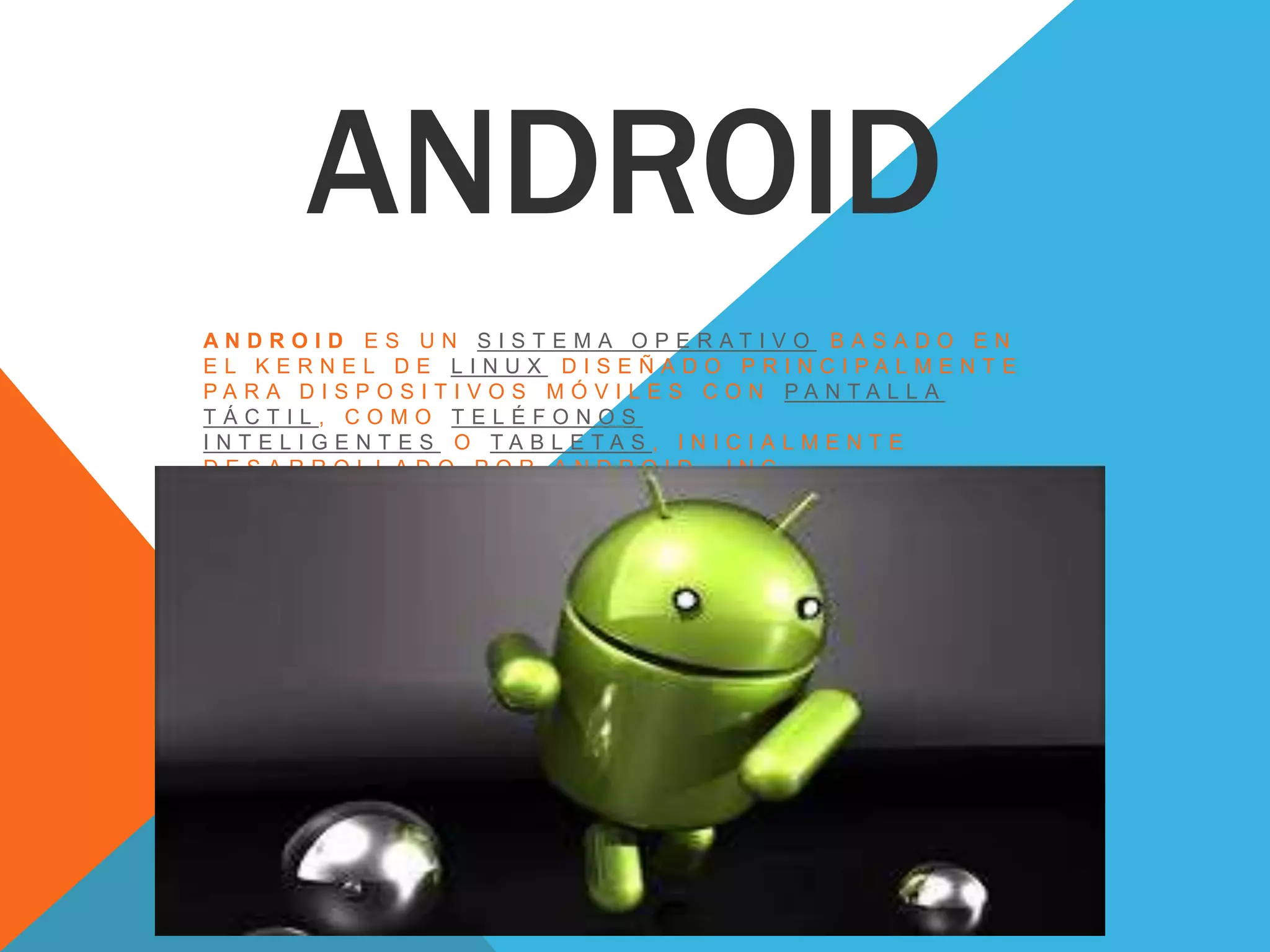 El documento habla sobre Android, un sistema operativo móvil basado en Linux diseñado para dispositivos táctiles como teléfonos inteligentes y tabletas. Android fue desarrollado inicialmente por Android Inc. y luego comprado por Google en 2005. Ha tenido numerosas actualizaciones que han agregado nuevas funciones y arreglado errores. Es un sistema popular debido a su gran comunidad de desarrolladores y variedad de aplicaciones disponibles.