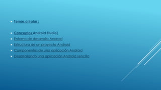 Este documento presenta los temas a tratar en un curso de programación Android. Cubre conceptos básicos como Android Studio, la estructura de proyectos Android y sus componentes. También explica el desarrollo de interfaces de usuario en Android mediante layouts, controles básicos y de selección, así como menús, widgets, preferencias de usuario y el uso de bases de datos SQLite.