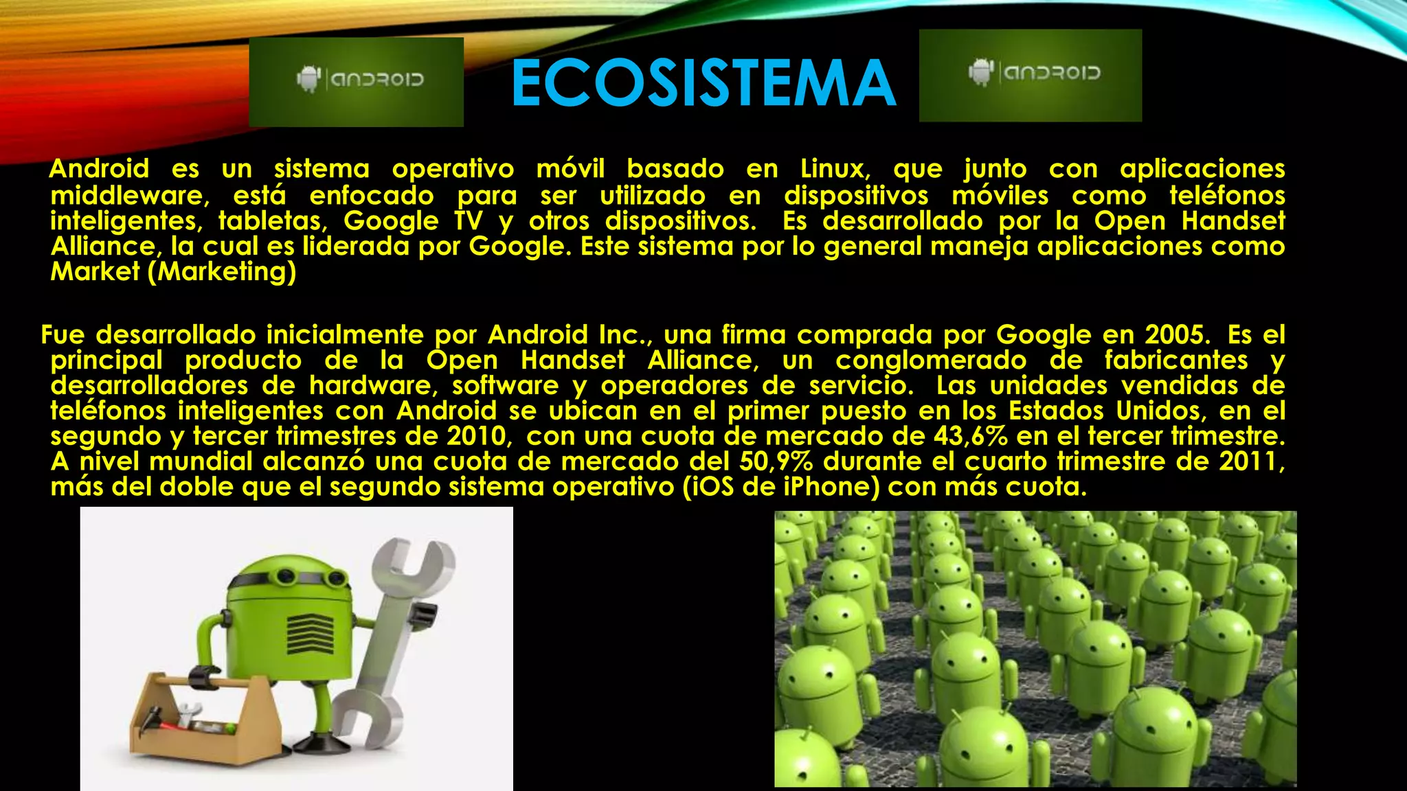 Android es un sistema operativo móvil de código abierto desarrollado originalmente por Android Inc. y ahora por Google. Es el sistema operativo más popular para dispositivos móviles a nivel mundial. Se ejecuta principalmente en teléfonos inteligentes y tabletas, y es desarrollado por la Open Handset Alliance y liderado por Google. El documento describe la historia, arquitectura, lenguajes de programación y ecosistema de aplicaciones de Android.