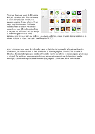 El documento describe varias aplicaciones para Android enfocadas en viajeros y gamers, destacando Expedia Hoteles para facilitar reservas y la navegación con Google Maps. También menciona juegos como un tablero de colores, un juego de rol desafiante llamado Wayward Souls y la popularidad de Minecraft en plataformas móviles. Además, se sugiere optimizar el rendimiento del dispositivo al jugar títulos como Grand Theft Auto: San Andreas.