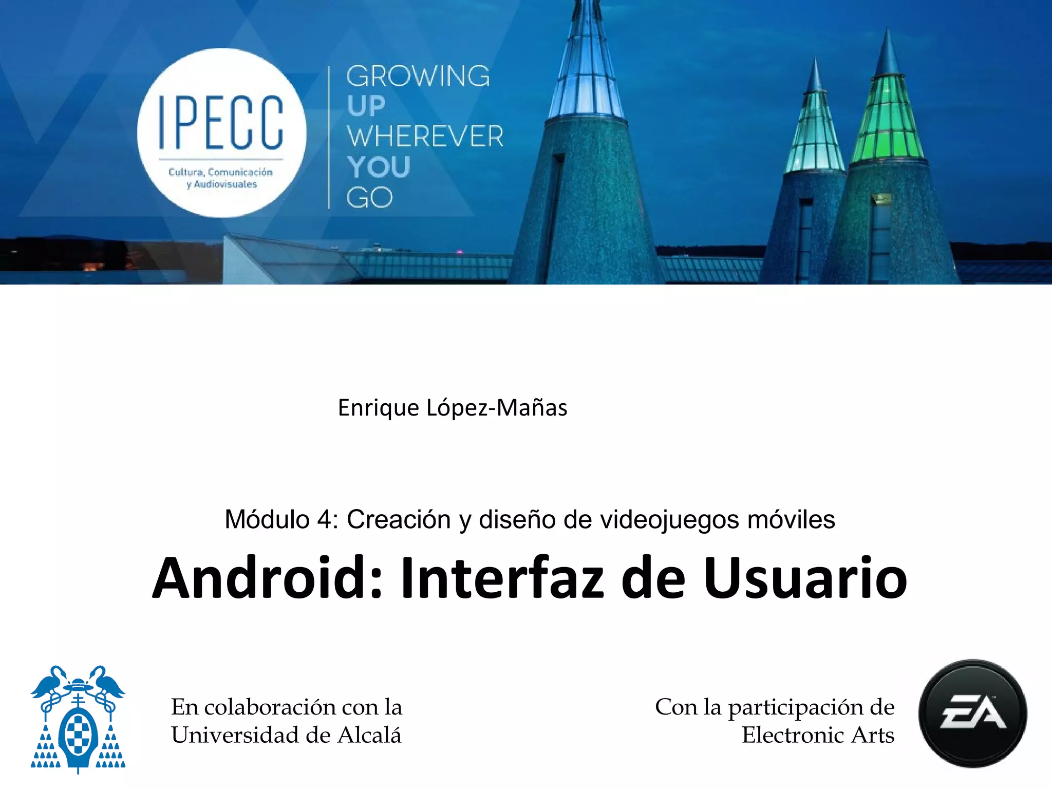 El documento es una guía sobre el diseño y creación de interfaces de usuario para videojuegos móviles en Android, cubriendo aspectos como la estructura de views y viewgroups, así como la captura de eventos de interacción del usuario. Se explica el uso de diferentes layouts (LinearLayout, TableLayout, RelativeLayout, FrameLayout, ScrollView) y proporciona información sobre cómo manejar el cambio de orientación y notificaciones al usuario. También se detallan las unidades de medida y ejemplos de implementación de UI en tiempo de ejecución.