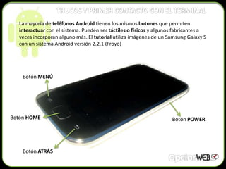El documento describe los botones y funcionalidades de los teléfonos Android, con un enfoque en un Samsung Galaxy S con la versión 2.2.1 de Android. Se mencionan diversos launchers y cómo interactuar con la interfaz, incluyendo el acceso a notificaciones, tareas recientes y opciones rápidas. Además, se detalla el uso del botón de encendido y el menú de accesos directos y widgets en el escritorio.