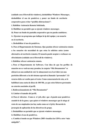 Se crearán perfiles móviles ocultos para algunos usuarios. También se creará un perfil obligatorio "invitado" sin acceso a los recursos de la empresa. El administrador configurará directivas de grupo para permitir asistencia remota, estandarizar el escritorio y restringir el uso de USB. También redireccionará la carpeta "Mis Documentos" a la red y limitará el tamaño de los perfiles. Por último, instalará DFS y probará su funcionamiento.