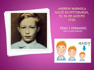 Andy Warhol nació en 1928 en Pittsburgh y desde pequeño le gustaba dibujar. En 1948 se mudó a Nueva York para dedicarse al arte y pronto se convirtió en uno de los artistas más importantes del pop art, creando obras que convertían objetos cotidianos como latas de sopa, plátanos, zapatos y animales en arte. Warhol vivía en una gran casa en Nueva York llena de objetos de arte y tenía 25 gatos todos llamados Sam.