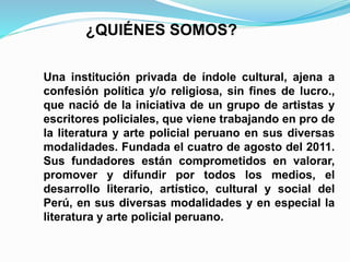 La Asociación Nacional de Escritores y Artistas Policiales del Perú (ANEAP-PERU) es una institución cultural privada sin fines de lucro fundada en 2011 por un grupo de artistas y escritores policiales. Sus objetivos incluyen promover y difundir la literatura y el arte policial peruano, fomentar la vida intelectual de sus asociados, y organizar eventos para impulsar el desarrollo cultural policial.
