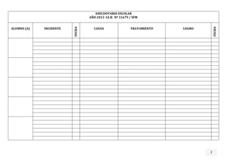 El documento es un anecdotario escolar para el año 2013 de una institución educativa. Contiene una tabla con columnas para el nombre del alumno, incidente, causa, tratamiento y logro de cada caso reportado a lo largo del año, así como las fechas de los sucesos y seguimientos realizados.